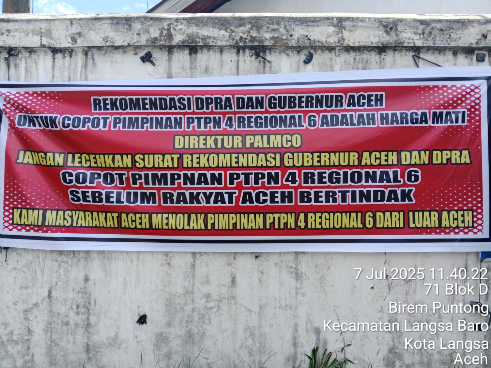 Spanduk-spanduk ini diketahui dipasang di Kabupaten Aceh Tamiang, Aceh Timur, Aceh Utara, dan Kota Langsa, yang seluruhnya berada di wilayah kerja HGU PTPN IV Regional 6.